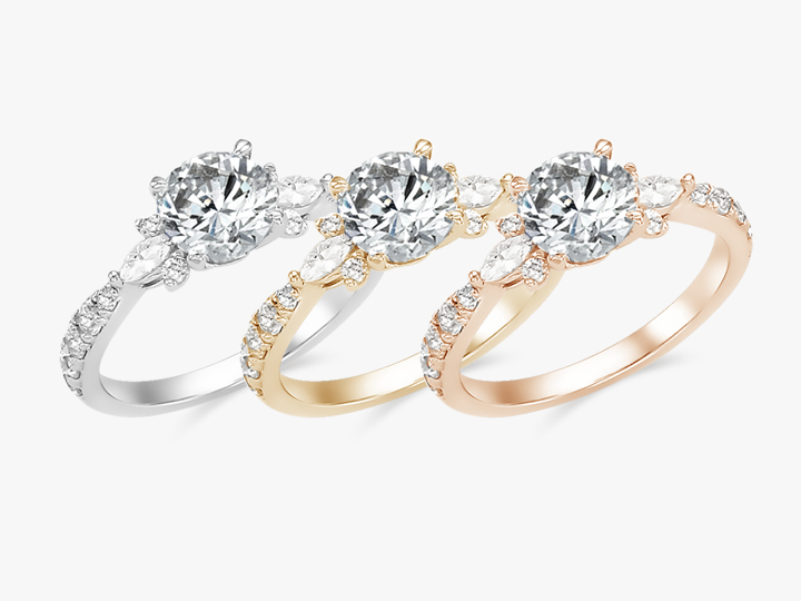 환하게 피어난 1캐럿 다이아몬드 양 옆으로 마퀴즈 팬시 스톤이 장미 꽃잎을 닮은 디자인입니다.