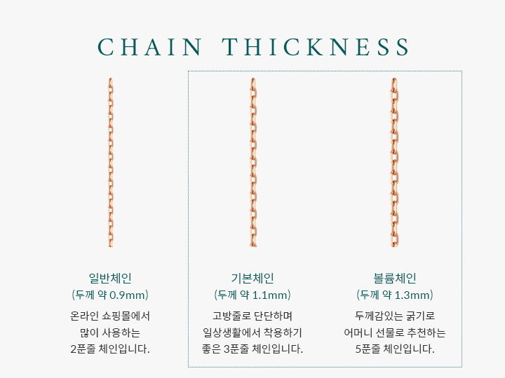 많은 온라인 쇼핑몰에서 사용하는 잘 끊어지는 얇은 체인(2푼줄)은 사용하지 않습니다.